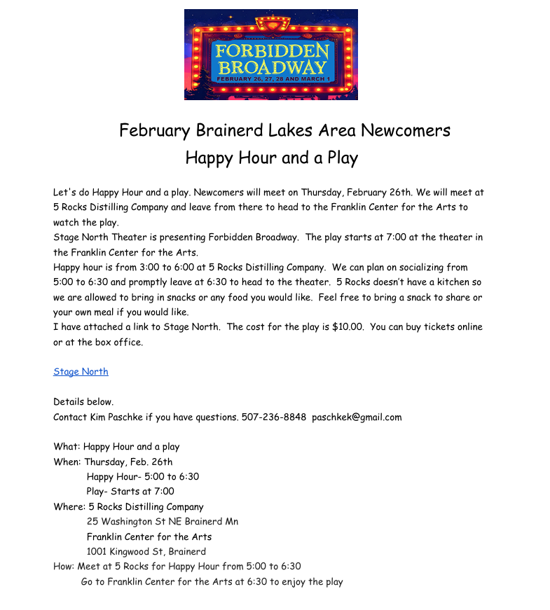 Our next big event is March 7th from 7-9pm at Jack Pine Brewery. Enjoy quality craft beer, learn about several of our area service clubs - their focus, their projects, their impact on our community - and socialize with your fellow newcomers. Thank you to Brainerd Lakes Area Community Foundation for sponsoring a portion of the evening!